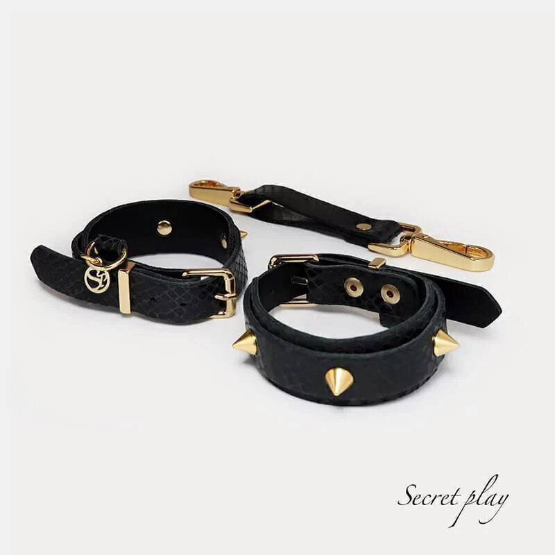 Algema com 05 furos (acompanha 2 conectores dourados), 2 cm de largura na parte central chegando 1,5 cm na parte mais fina com a fivela e pingente Secret Play.